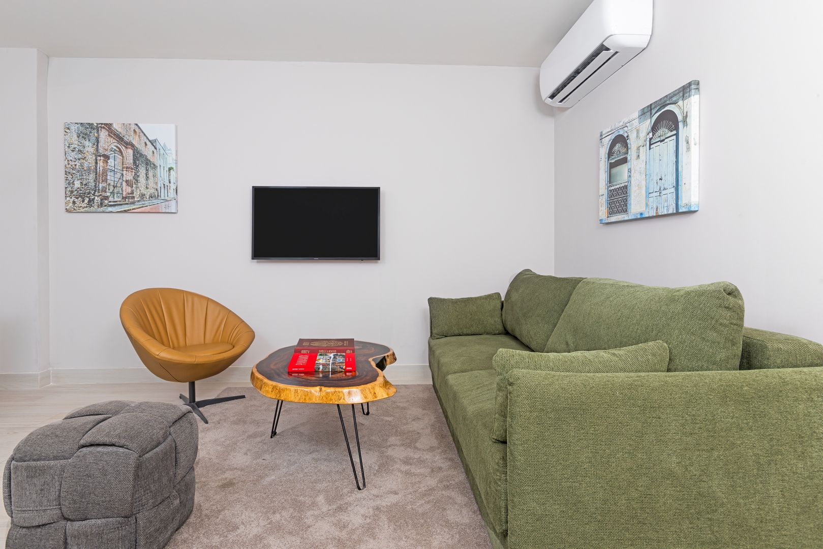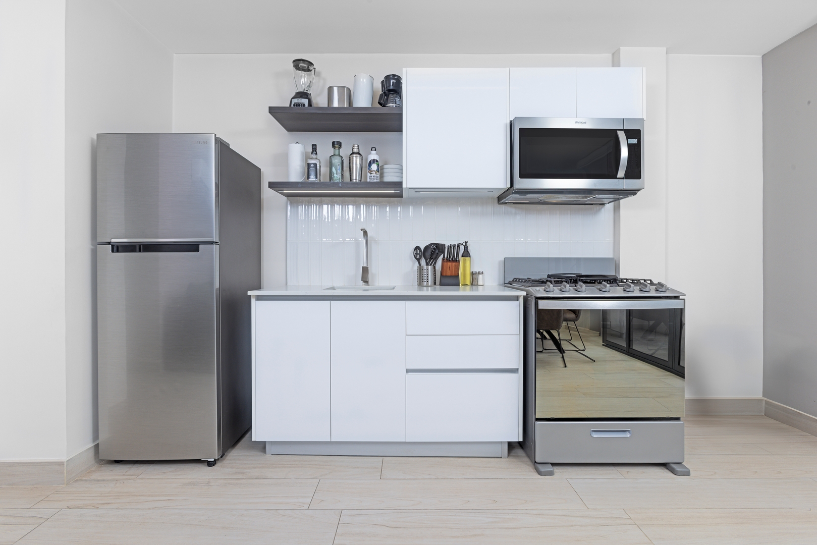 Your apartment includes a fully equipped kitchen, premium bathroom amenities, modern appliances, a washer/dryer, ironing board, and hair dryer for your convenience.