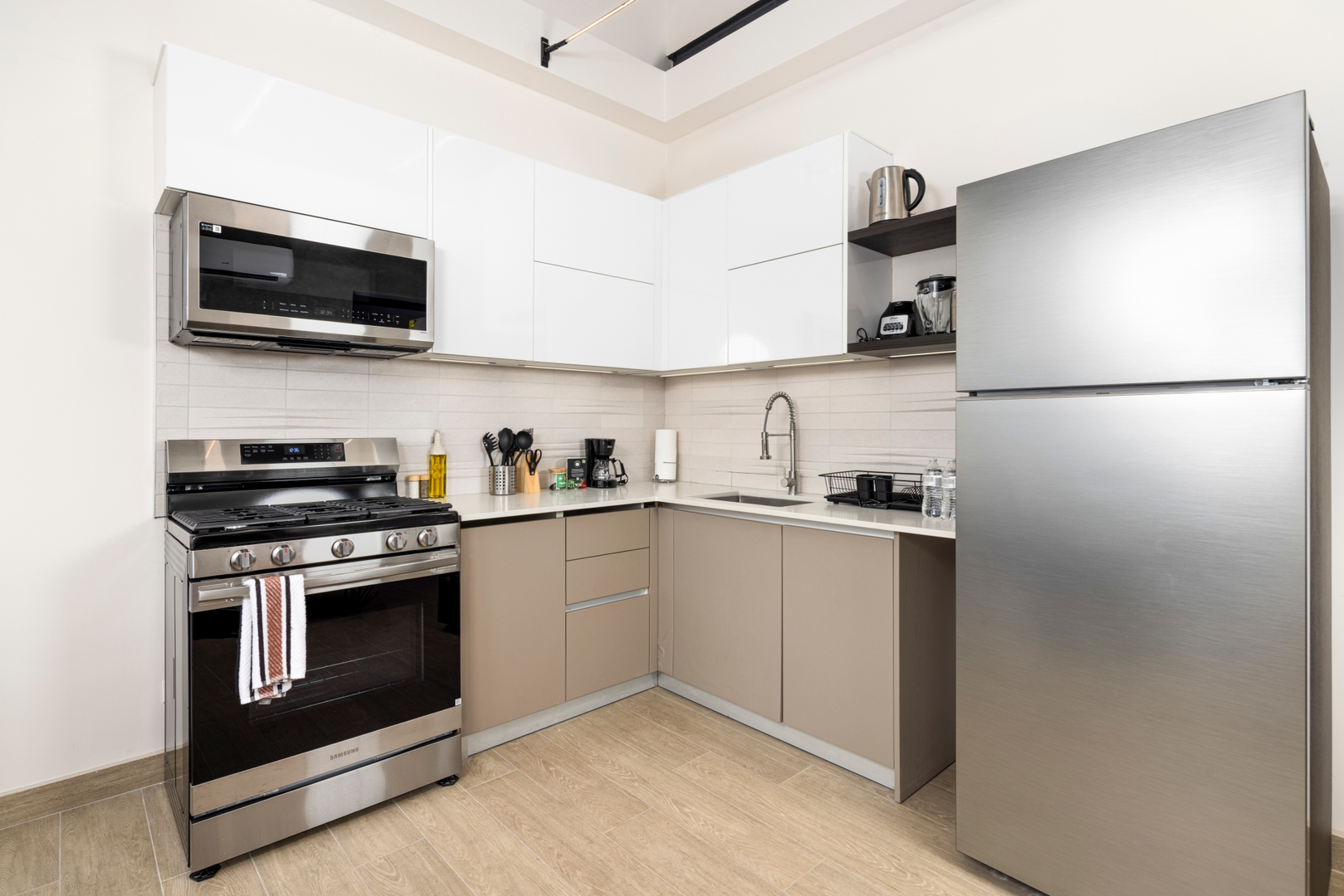 Your apartment includes a fully equipped kitchen, premium bathroom amenities, modern appliances, a washer/dryer, ironing board, and hair dryer for your convenience.