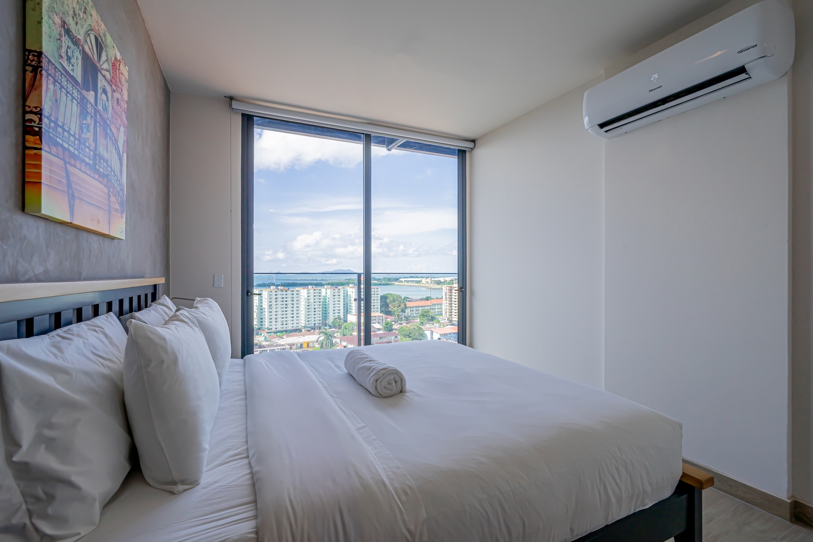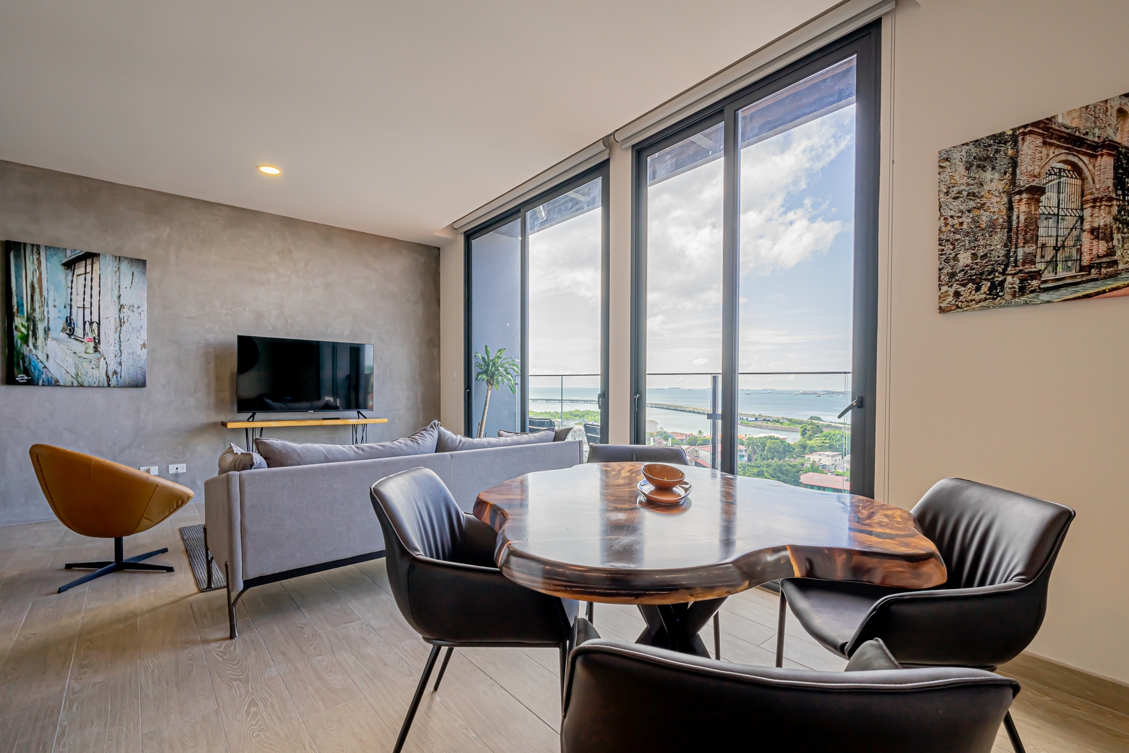 Our meticulously designed 123 m² (1,323 ft²) penthouse apartment invites you to unwind in elegance. With expansive floor-to-ceiling windows and private balconies, you’ll be captivated by panoramic views of the historic old city, the breathtaking Pacific Ocean, and the vibrant modern skyline. Inside, discover top-tier finishes, including bespoke live-edge wood tables, luxurious hospitality Euro-top mattresses, and striking local photography that embodies the spirit of Panama.