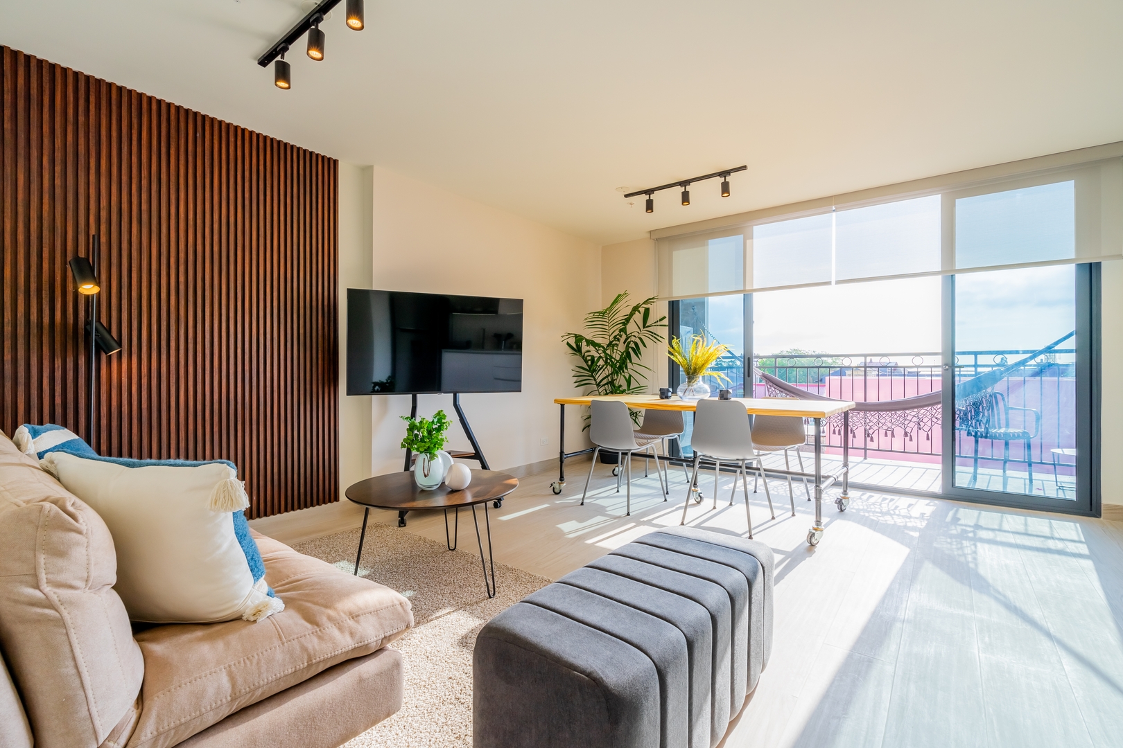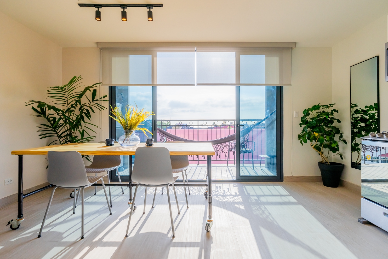 Our meticulously designed 55 m² (592 ft²) apartment invites you to unwind in elegance. With expansive floor-to-ceiling windows and private balconies, you’ll be captivated by panoramic views of the historic old city, the breathtaking Pacific Ocean, and the vibrant modern skyline. Inside, discover top-tier finishes, including bespoke live-edge wood tables, luxurious hospitality Euro-top mattresses, and striking local photography that embodies the spirit of Panama.