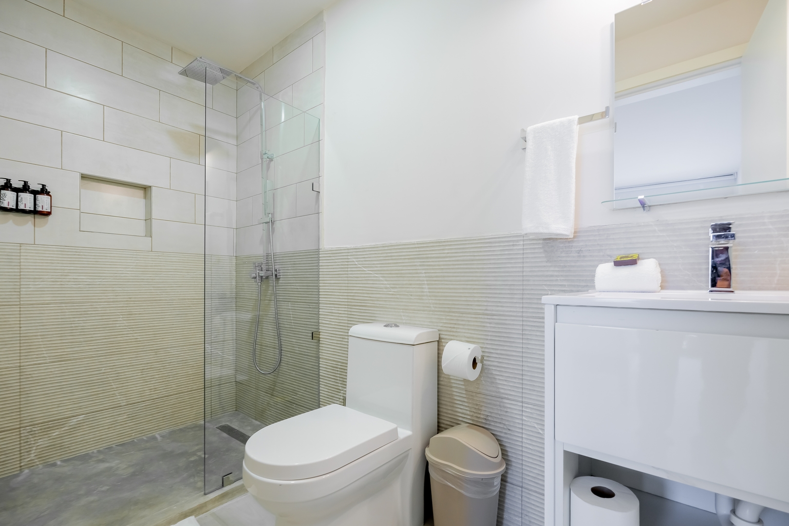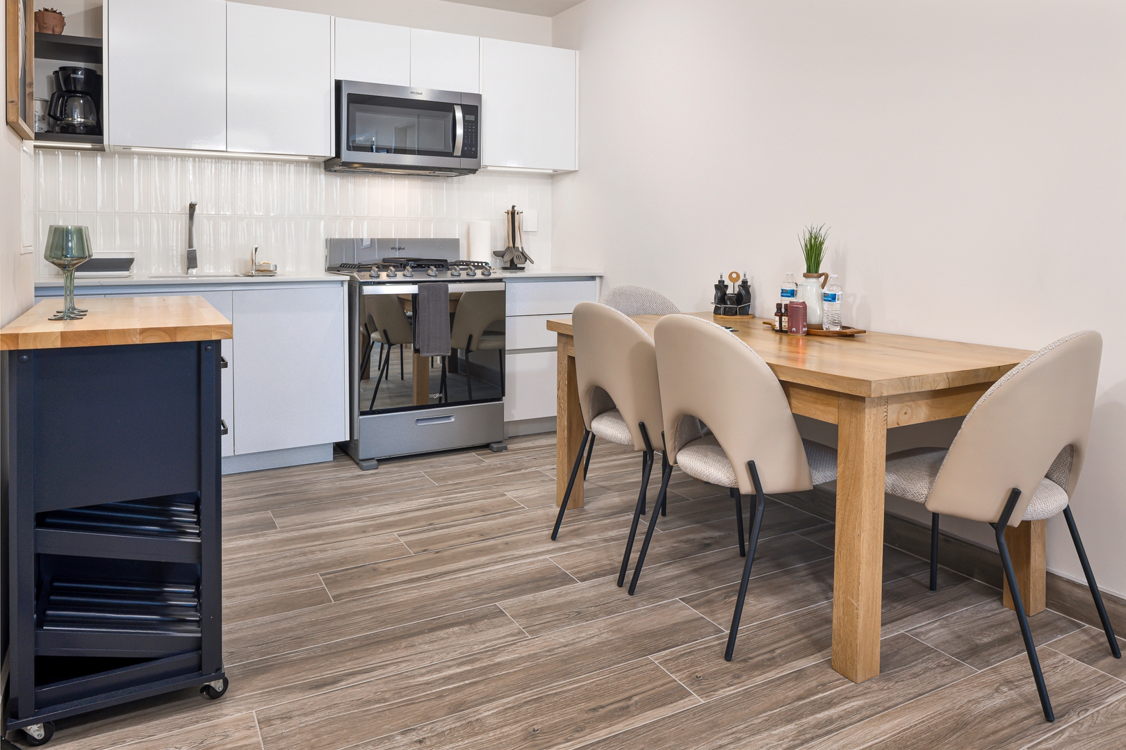 Your apartment includes a fully equipped kitchen, premium bathroom amenities, modern appliances, a washer/dryer, ironing board, and hair dryer for your convenience.