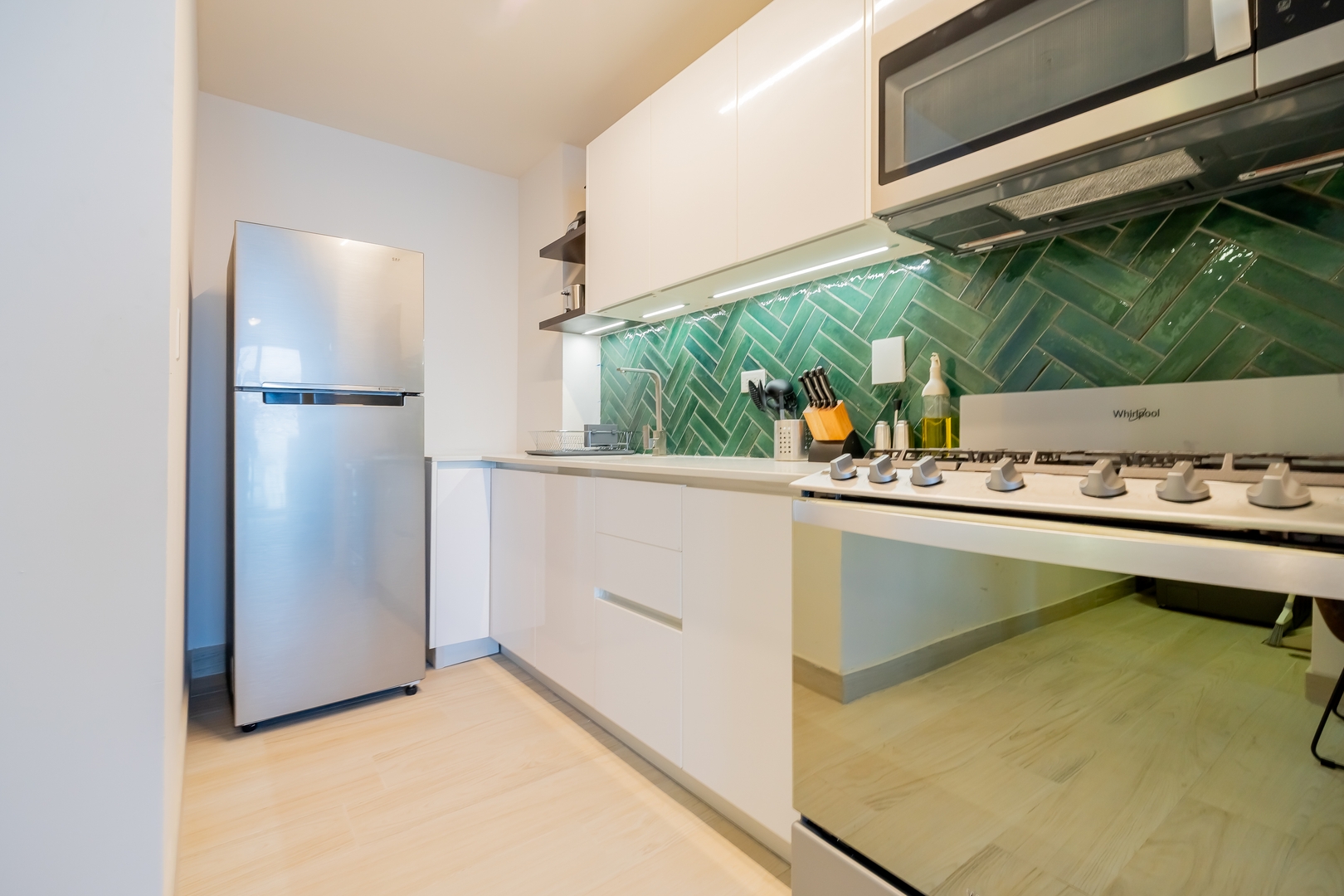 Your apartment includes a fully equipped kitchen, premium bathroom amenities, modern appliances, a washer/dryer, ironing board, and hair dryer for your convenience.
