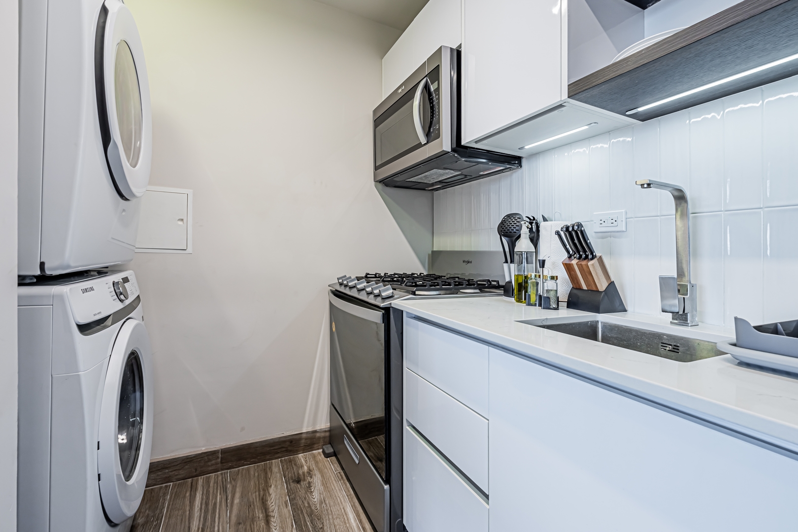 Your apartment includes a fully equipped kitchen, premium bathroom amenities, modern appliances, a washer/dryer, ironing board, and hair dryer for your convenience.