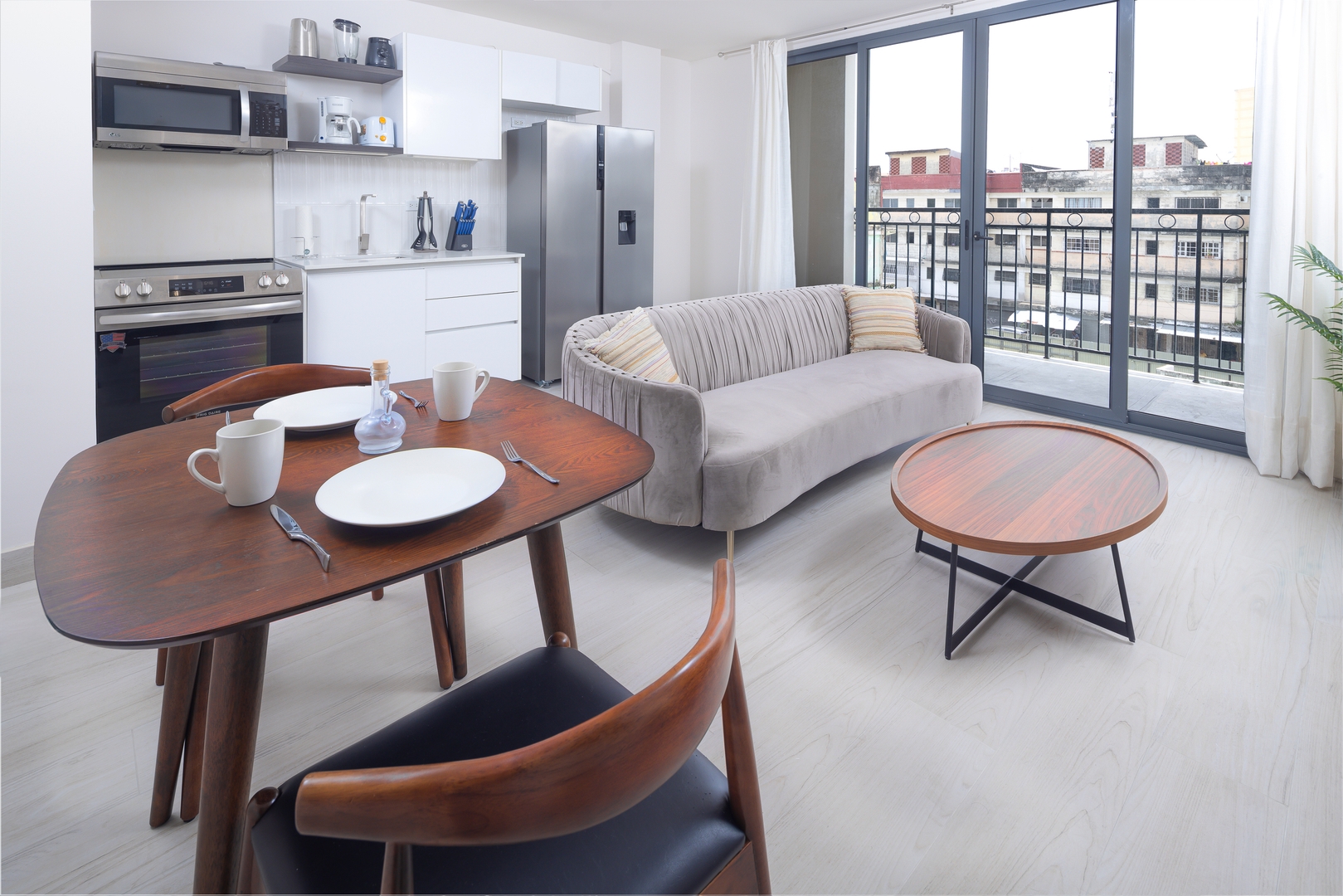 Our meticulously designed 54 m² (581 ft²) apartment invites you to unwind in elegance. With expansive floor-to-ceiling windows and private balconies, you’ll be captivated by panoramic views of the historic old city, the breathtaking Pacific Ocean, and the vibrant modern skyline. Inside, discover top-tier finishes, including bespoke live-edge wood tables, luxurious hospitality Euro-top mattresses, and striking local photography that embodies the spirit of Panama.